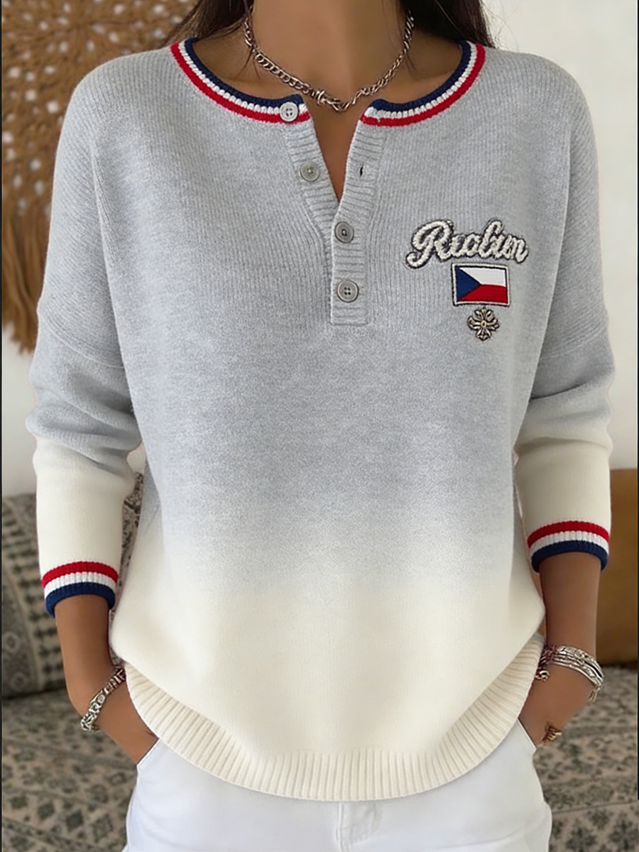 Dámské stylový šedý gradient česká vlajka vyšívaný henley svetr
