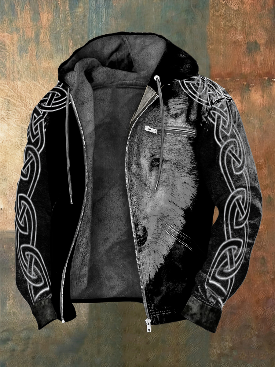Férfi karcsú fekete viking wolf & csomómű nyomtatás sherpa bélelt kabát