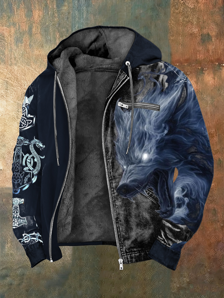 Férfi misztikus kék viking wolf & csomómű nyomtatás sherpa bélelt kabát