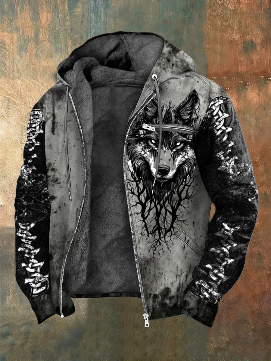 Férfi sötét splatter viking wolf & roots nyomtatás sherpa bélelt kabát