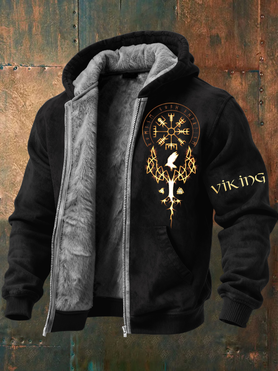 Men black viking tree of life & rune print fleece lined hooded jacket