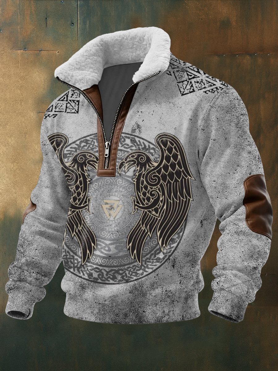Men distress grey viking raven & rune pattern fleecelined sweatshirt