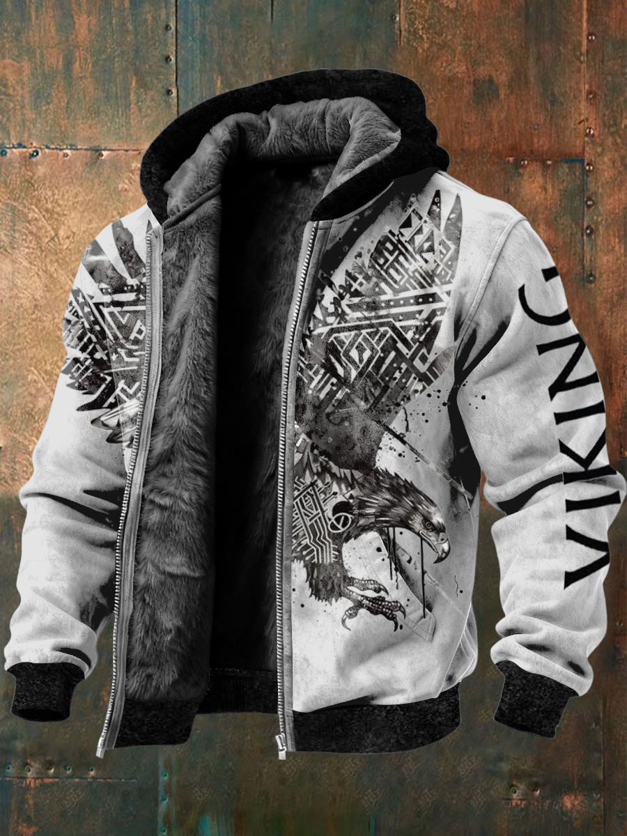 Men edgy monochrome eagle & viking print fleecelined jacket