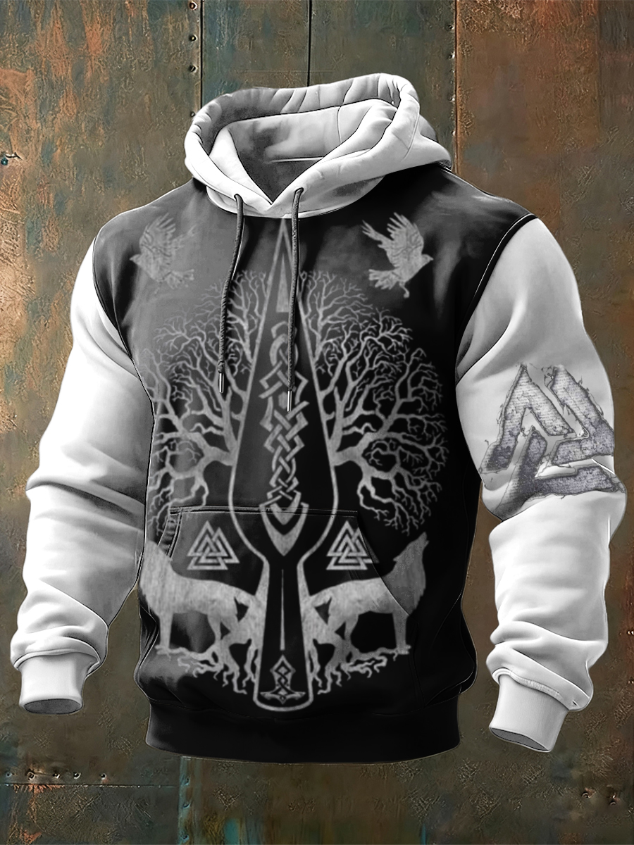 Men mystical yggdrasil tree & wolf print colorblock hoodie
