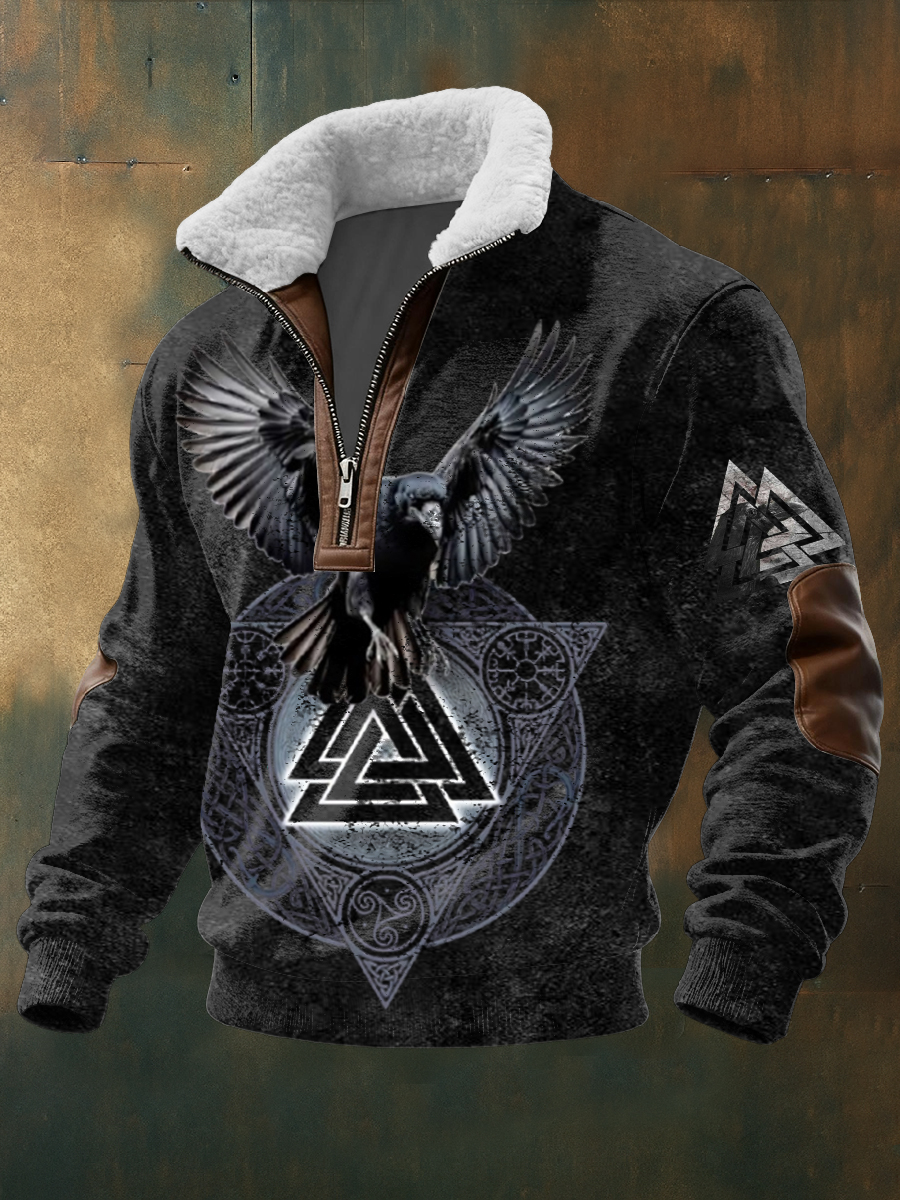Men sleek black raven & valknut graphic fleece sweatshirt