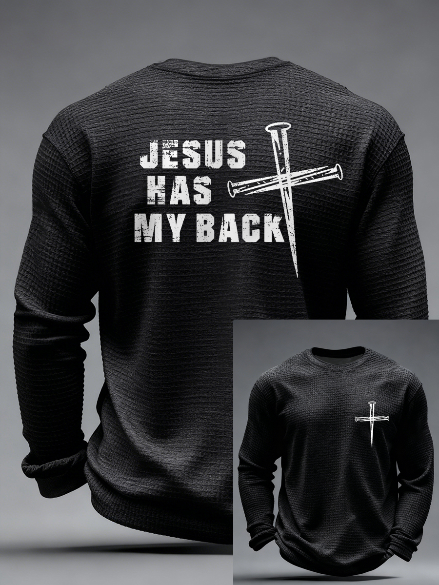 Mens jesus has my back cross faith print casual waffle long sleeve tshirt
