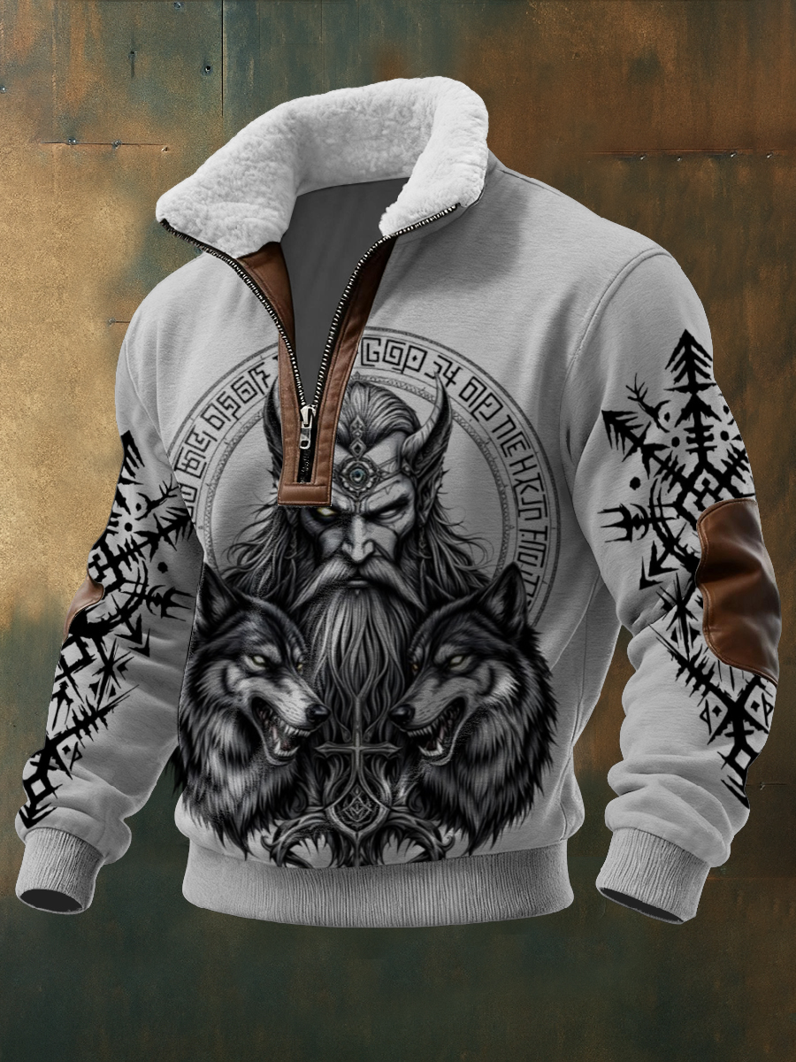 Mens norse god & wolf print sherpalined zip sweatshirt