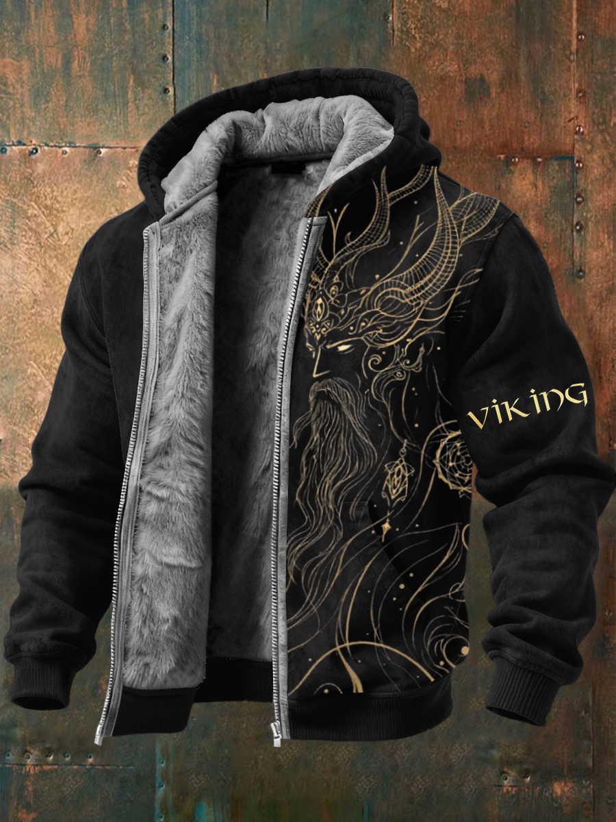 Pánské černé viking bůh zlaté tisk fleece lemované s kapucnou bundu