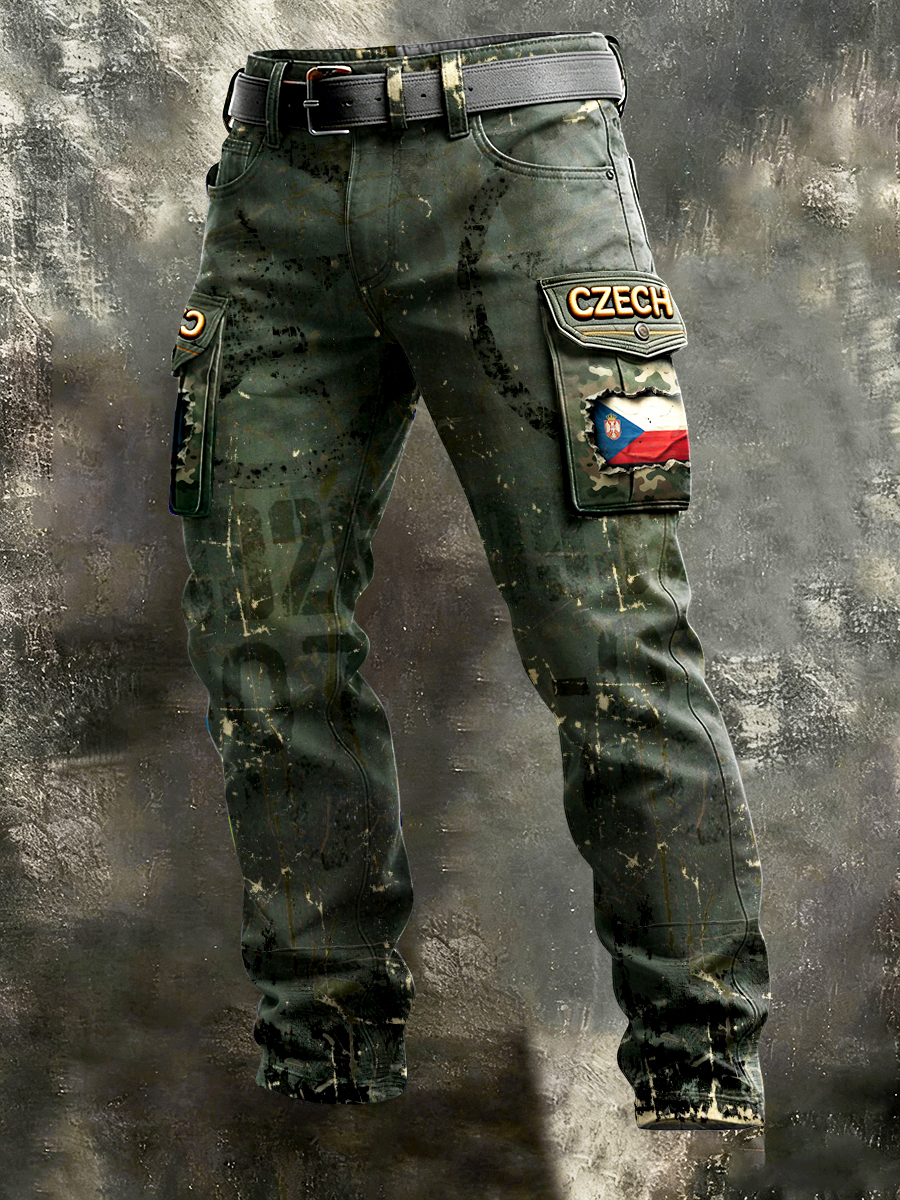 Pánské české vlajky vytisknout vojenské zelené vintage pracovní kalhoty