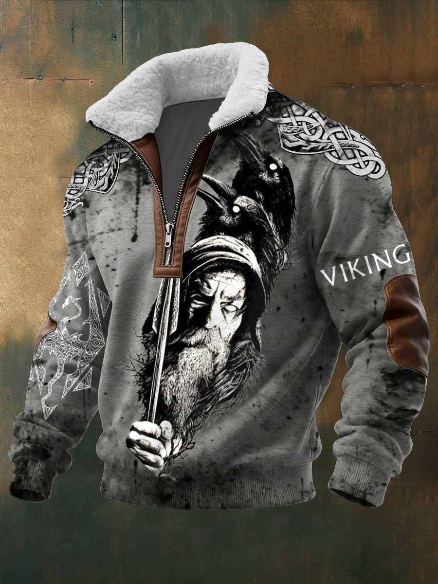 Pánské edgy viking crow splatter print sherpa golier sweatshirt