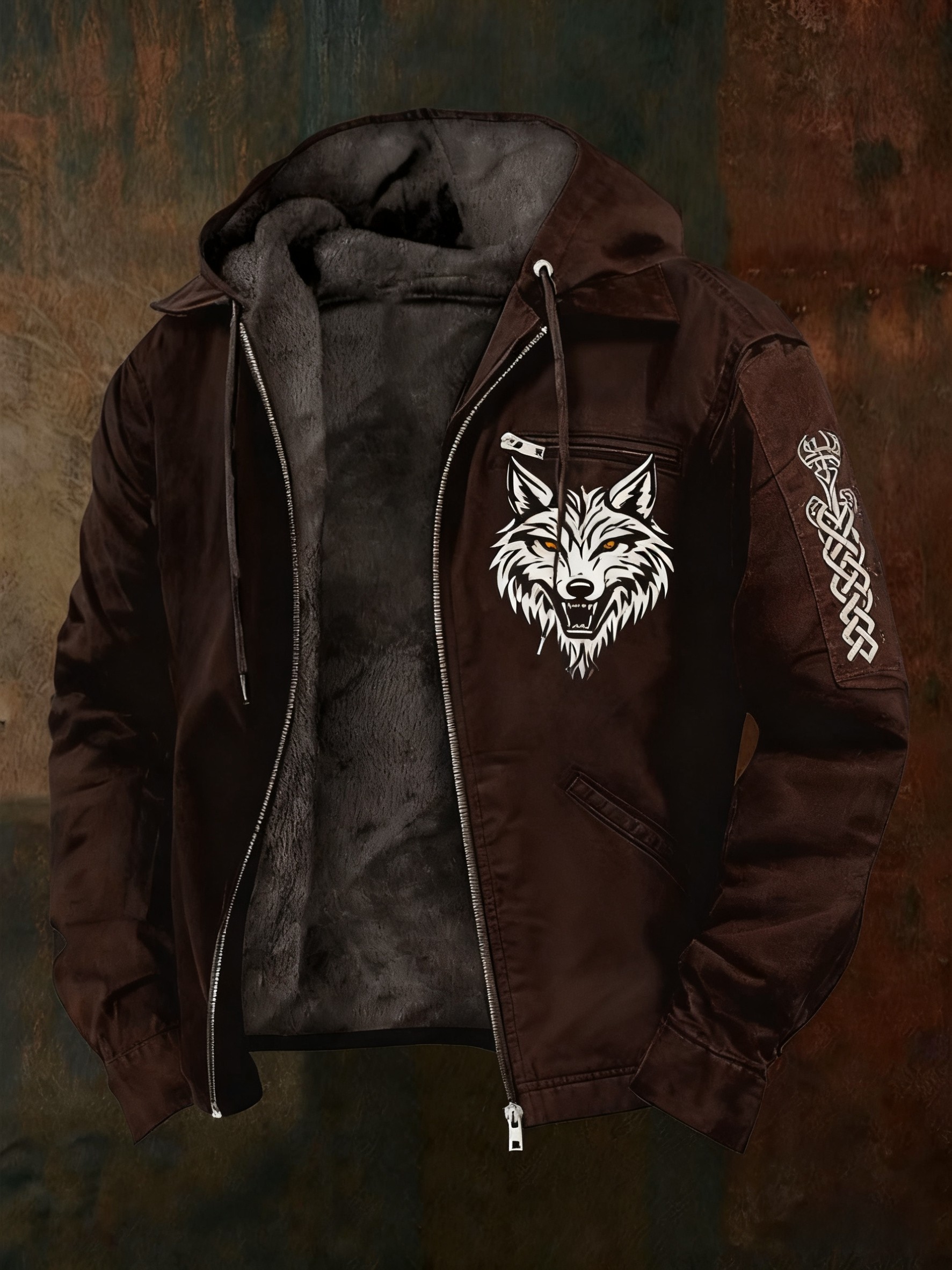 Pánské retro viking celtic wolf patchwork vytištěné s dlouhými rukávy s kapucnou bundou