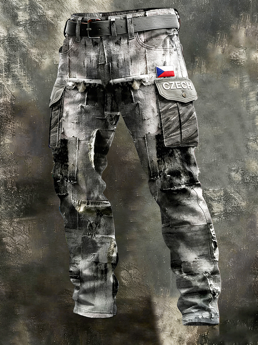 Pánské šedé české vlajky vintage patchwork print pracovní kalhoty