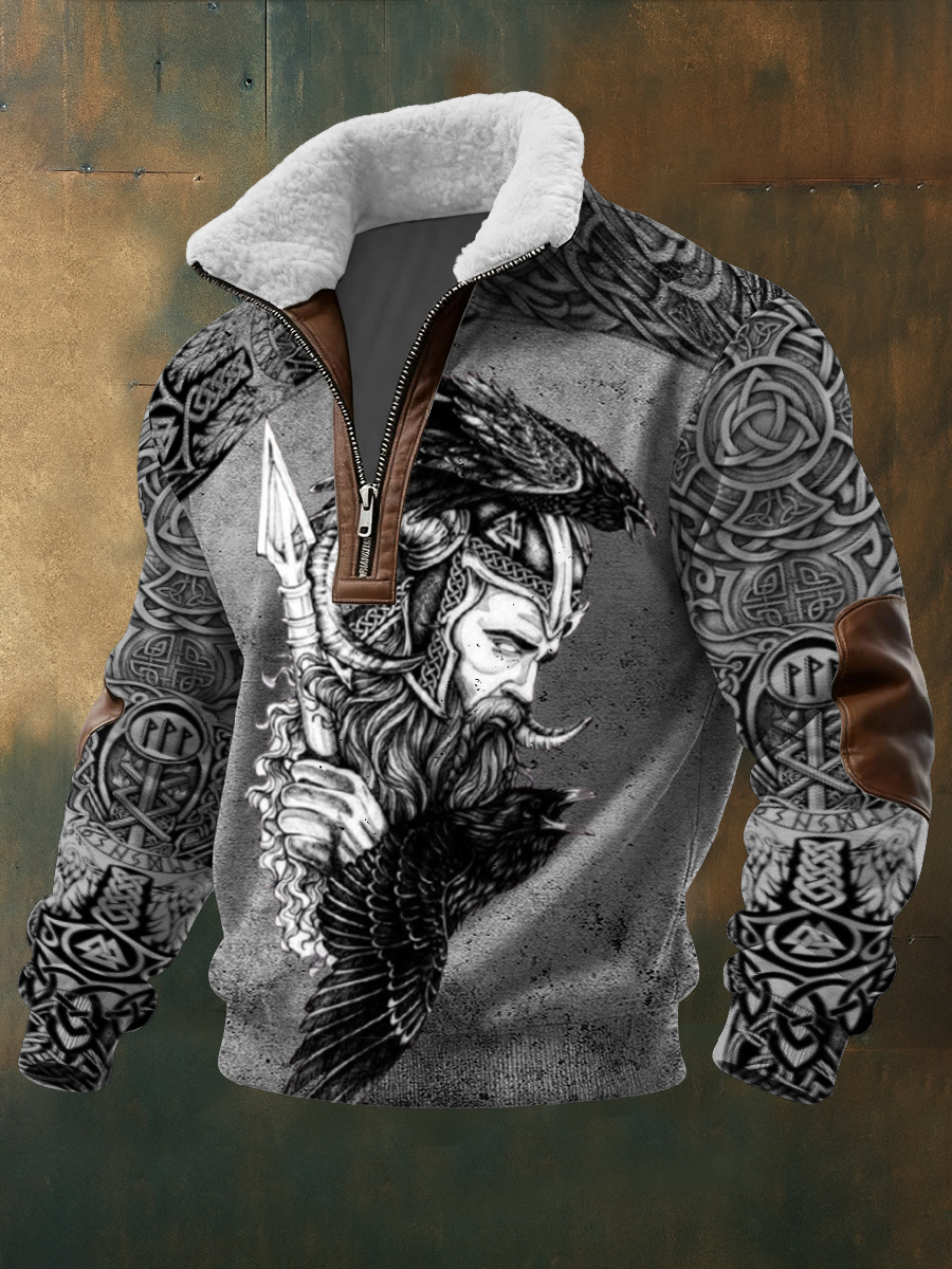 Pánské složité viking rune & crow print sherpa collar sweatshirt