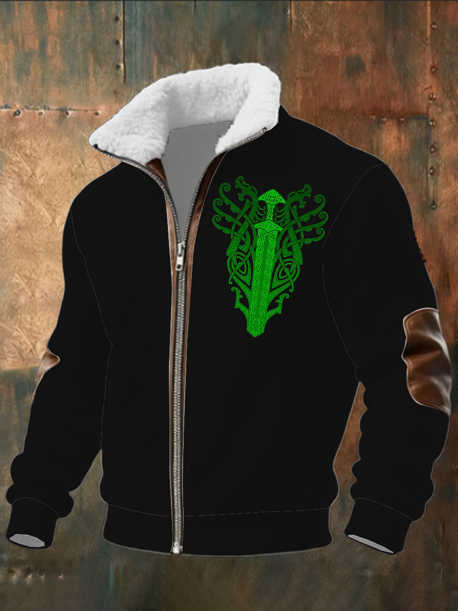 Pánské zelené keltské meč tisk sherpalemovaný zip bunda