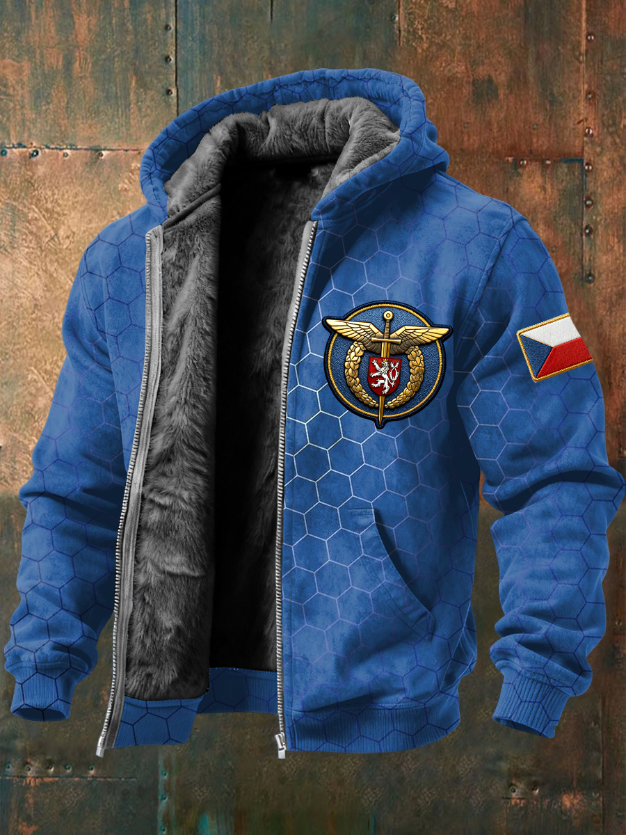 Retro czech air force emblem textured fleecelined hooded jacket