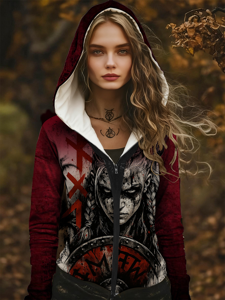 Ženské intenzivní červený přízvuk viking bojovník tisk zipup hoodie